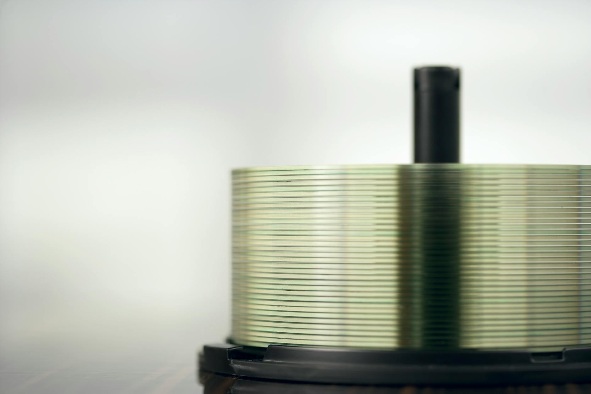 Stos płyt CD na szpindlu z widoczną błyszczącą powierzchnią